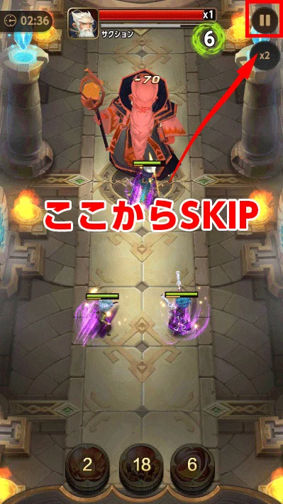 チュートリアルでは、戦闘が開始されたときに右上に出てくる一時停止アイコンを押すことでチュートリアルすべてをスキップ可能です。チュートリアル中に引ける無料ガチャ分も後から好きなタイミングで引くことができるので飛ばしてしまってかまいません。