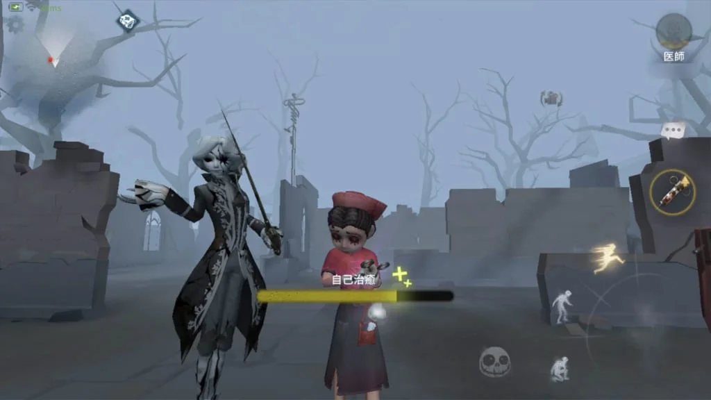 医師エミリーは、味方を助ける際に自身を攻撃させてかばう場合が多く、攻撃後は医師と逃げたサバイバーのどちらを追うか迫られます。