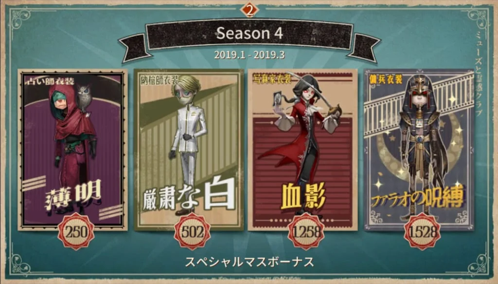シーズン4の推理の径スペシャルマスボーナス衣装は以下の4キャラクターです