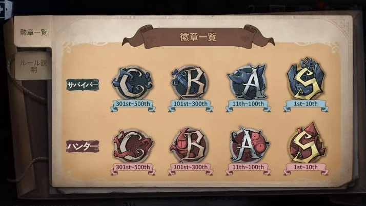ハンター・サバイバーそれぞれのキャラクターごとに独立したランキングとなっており、毎週500位内のプレイヤーには徽章(きしょう)というバッジのようなものが送られます