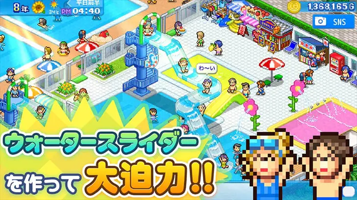 プールが大きくなると次々お客さんが来るようになるので、飲食店や販売施設を設置してお金を貯めます。その資金を元手に次々豪華なオリジナルプールを作成していきましょう。
