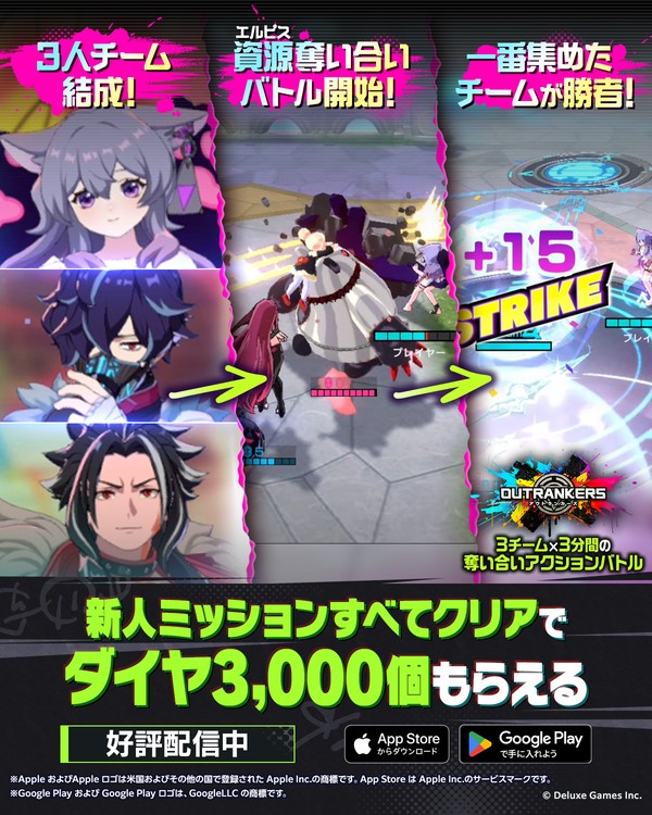 『アウトランカーズ』は、3人1組の3チームに分かれて資源を奪い合う奪い合い協力アクションです。