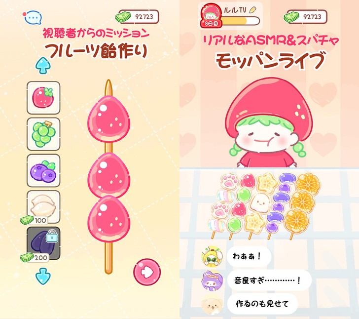 『フルーツ飴の達人』は、フルーツ飴を作り、配信で人気者を目指す料理シミュレーションです。