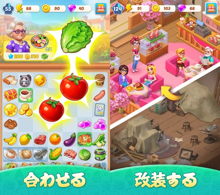 『マージクッキング』は、食材を組み合わせて世界中の料理を作り、自分のお店を発展させていくパズルゲームです。