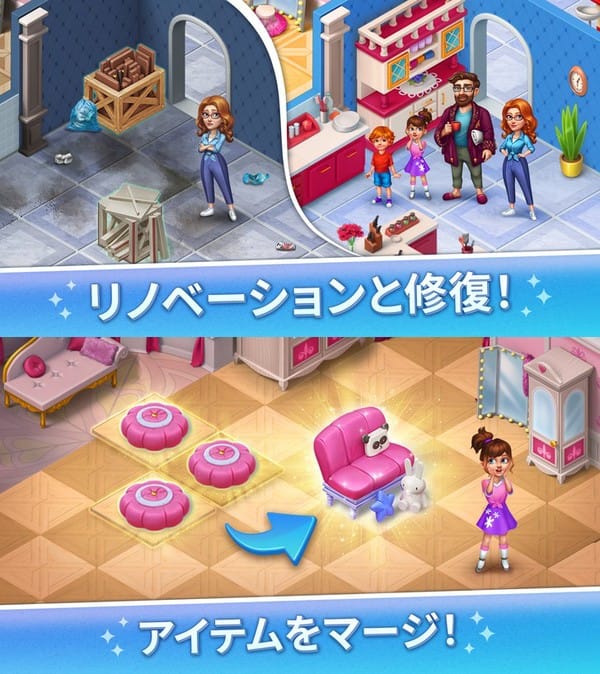 『Travel Merge Family』は、同じ素材を組み合わせて、豪華な邸宅を自分好みにリフォームしていくパズルアドベンチャーです。