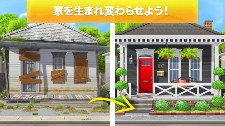 『ホームデザイン メイクオーバー』は、パズルを解いて資金を貯め、世界各地の家を劇的に作り変えるパズルリノベーションです。