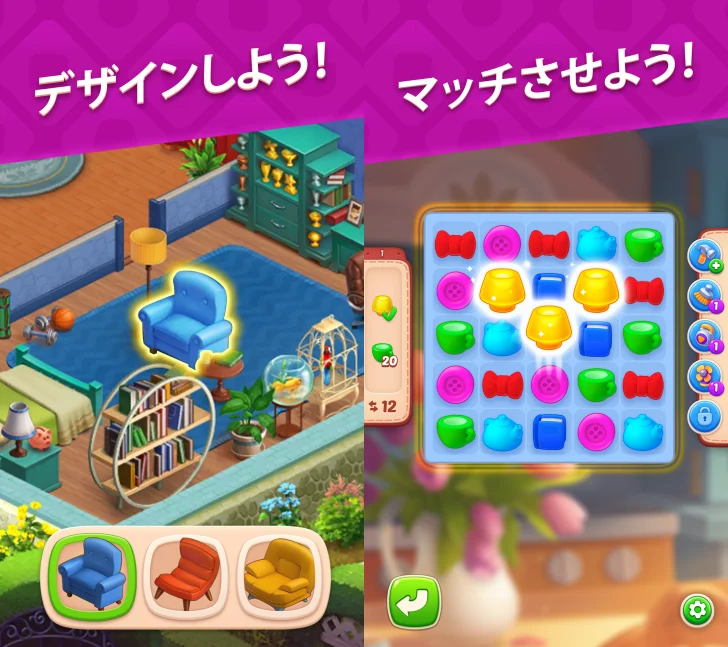 『ホームデザインストーリー』は、様々な部屋を改築しながら、トップデザイナーを目指していく家づくりパズルです。
