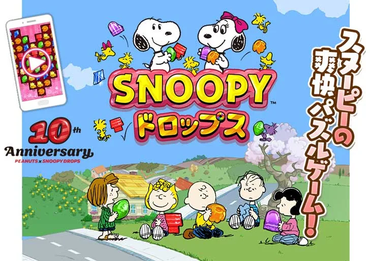 『スヌーピー ドロップス』は、キラキラのドロップを3つ以上そろえて消す簡単なパズルゲームをスヌーピーと一緒に楽しめるパズルゲームです。