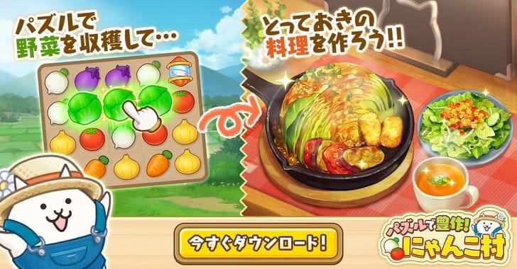 『にゃんこ村』は、にゃんこ大戦争のPONOSが贈る、ネコたちと荒れた村を再建していくマッチ3パズルです。