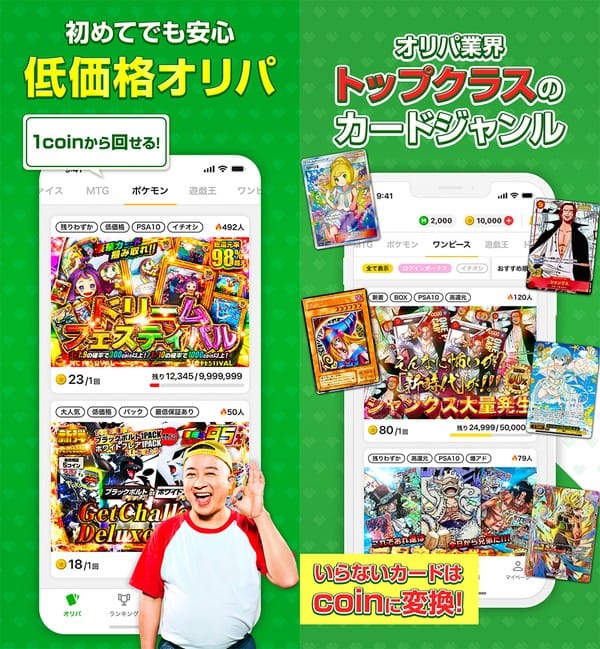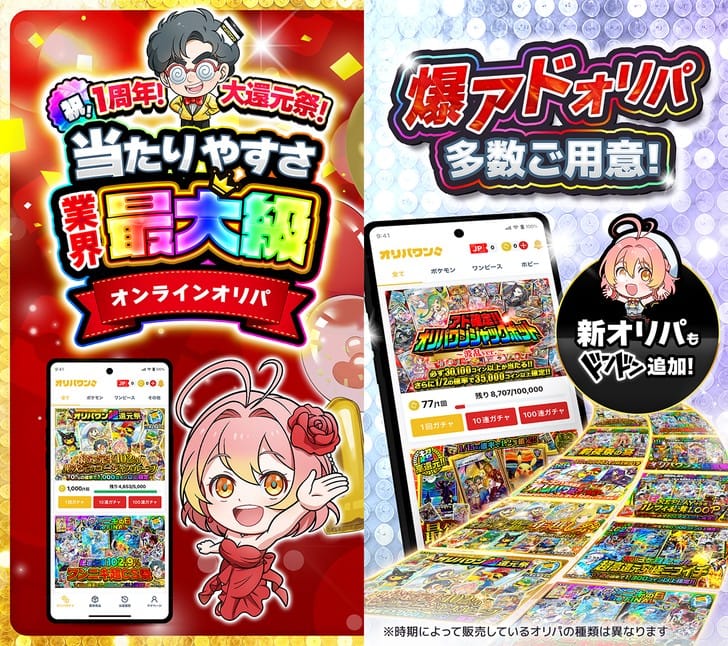 『オリパワン』は、ポケモンカードやワンピースカードをスマホで手軽に引ける、業界最大級のオンラインオリパアプリです。