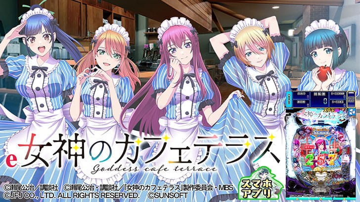 『e女神のカフェテラス』は、瀬尾公治先生描き下ろしイラストや楽曲をフルで楽しめる実機さながらのパチンコシミュレーターです。