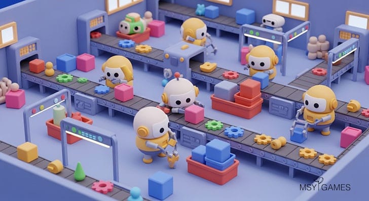 ブロックを積む感覚で設備を自由に配置し、コンベアや射出装置を駆使して、立体的な生産ラインを構築するパズル的な楽しさが味わえます。