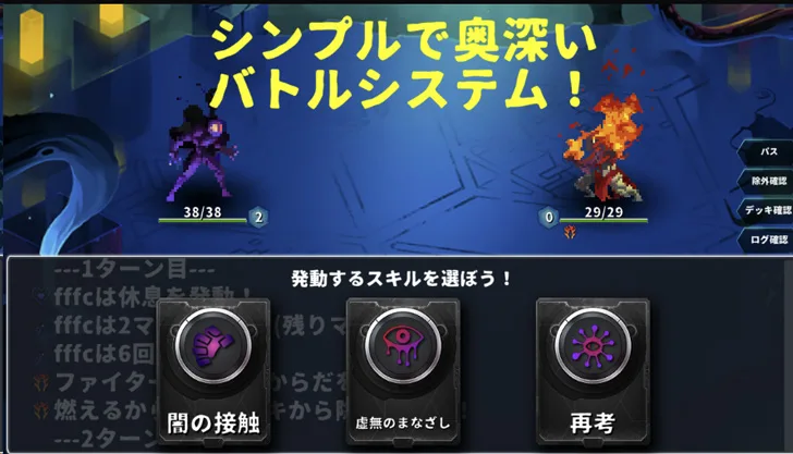 戦闘はターン制。「ダメージを与える」「カードをドローする」といった豊富なカードから戦略的にデッキを構築して戦います。