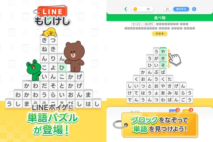 『LINE:もじけし』は、画面に並んだ文字をなぞって単語を見つけ出し、コインを集めてポイ活も楽しめる単語パズルゲームです。