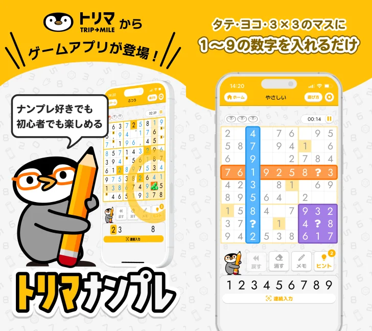 『トリマナンプレ』は、空いたマスに1から9の数字を埋めていくだけでマイルが貯まるポイ活ロジックパズルです。