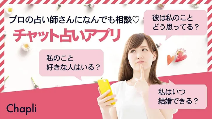 『Chapli(チャプリ) 』は、いつでも占い師にチャットや電話で気軽に相談できる占い相談サービスです。