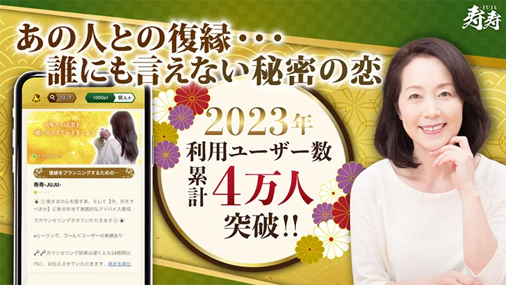 『寿寿-JUJU-』は、復縁や恋愛など、人間関係の悩みを抱えるあなたへ、専門家とチャットで相談できる恋愛相談アプリです。