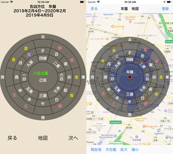- 外出や旅行の計画に便利引っ越しや旅行、パワースポット巡りなど、気になる時にすぐ方位を調べられて重宝しています。