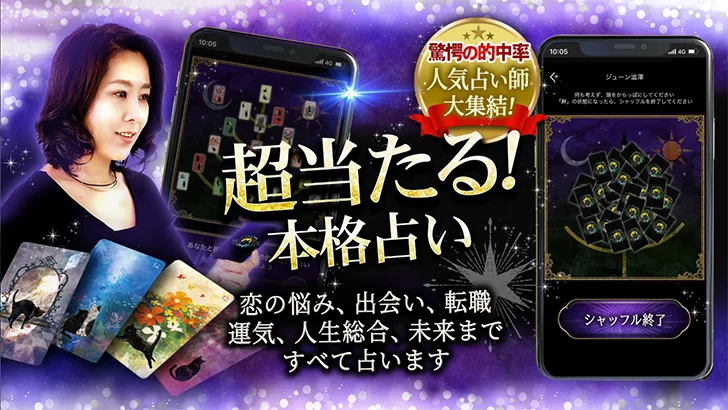 恋愛や仕事、人間関係の悩みを、1000名以上の占い師に1対1のチャットや電話でじっくり相談できます。