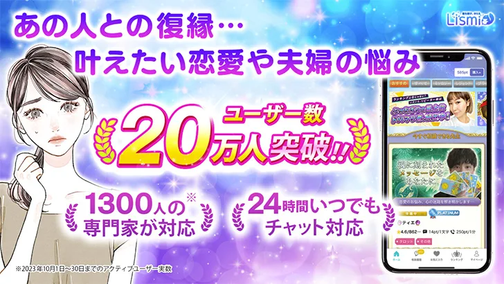 『リスミィ』は、恋愛や結婚、人間関係の悩みを日本全国の占い師に相談できるチャット相談アプリです。