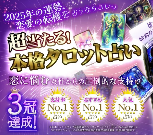 - 驚くほど当たる占い恋愛で利用しましたが、自分や彼の状況をズバリ当てられて驚きました。信頼できるアプリです。