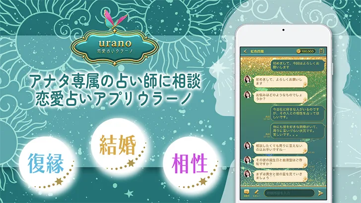『ウラーノ』は、復縁や結婚など恋愛の悩みを、専属占い師にチャットで相談できる占い相談アプリです。