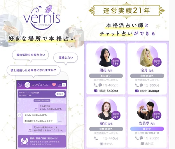 『ヴェルニ』は、いつでもどこでもプロの占い師に直接悩みを相談できるチャット・電話占いアプリです。