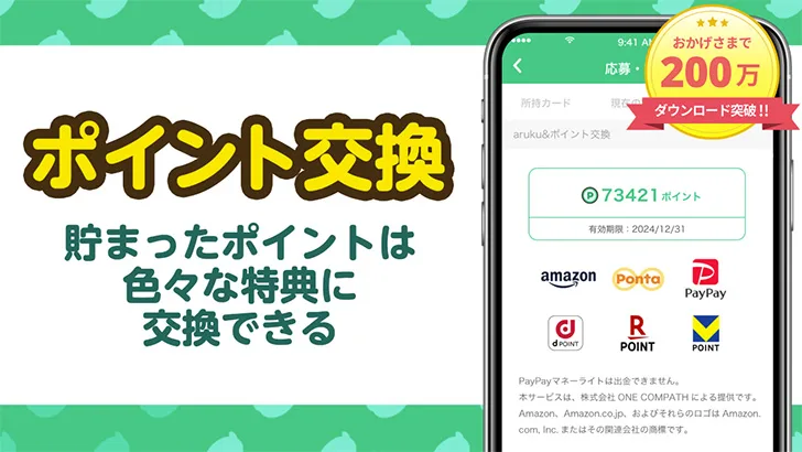 『aruku&(あるくと)』は、歩数に応じてポイントが貯まり、現金や電子マネー、賞品の抽選に応募できる、ウォーキングポイ活アプリです。