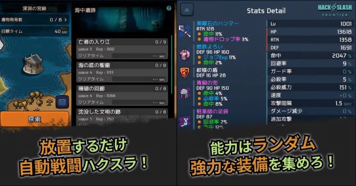 『ハクスラフロンティア』は、オートバトルで装備を収集し、キャラクターを無限に強化する放置型ハクスラRPGです。