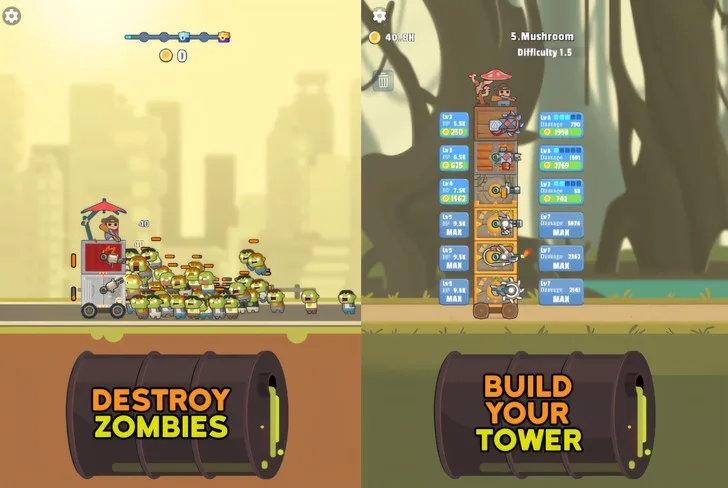 回転ノコギリや火炎放射器など多彩な武器を組み合わせ、自分だけの最強武装タワーを作成してゾンビをなぎ倒せます。