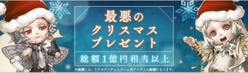 シノアリス【シノアリス】最悪のクリスマスプレゼント 2018.12.18 クロシノアリスの『それは最悪のクリスマスプレゼント-総額一億円相当以上-』をまとめています。 抽選方法や景品についてまとめているので参考にしてください。 開催期間 開催期間 2018年12月17日17:00~2018年12月…